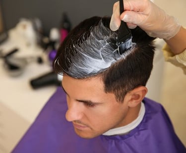 Hair colouring for beard, side locks, moustache and head using trusted professional colour brands.